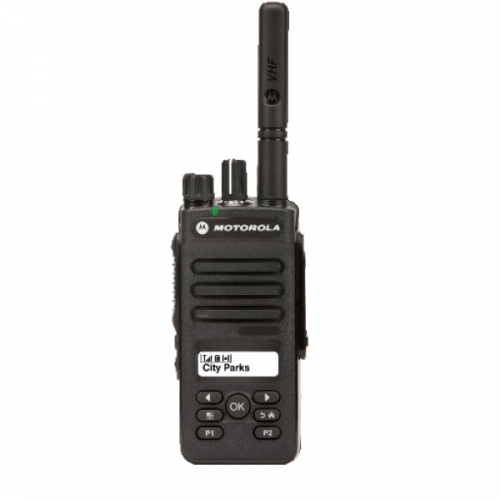 Monitoring supply needs on a manufacturing line or reporting an incident on a construction site, how do you keep employees connected and safe? MOTOTRBO™ Digital Radio Solutions Series radios can help by putting the power of digital communications within easy reach. Equip your team with the world’s most scalable digital radio solution. The DP2600 offers best-in-class audio in a scalable solution for your demanding communication needs. Intelligent audio and voice announcement features enable easy communication in difficult work environments. A crystal-clear black and white screen makes menu navigation and accessing contacts easy. This model is also analogue interoperable, enabling you to make the transition to digital at your own pace, all at a value that stands up to the competition. Available in UHF and VHF frequency bands, the DP2600 features a 2-line display and limited keypad for easy menu navigation with 128-channel capacity, three programmable buttons and IP55 specifications for protection when wet.